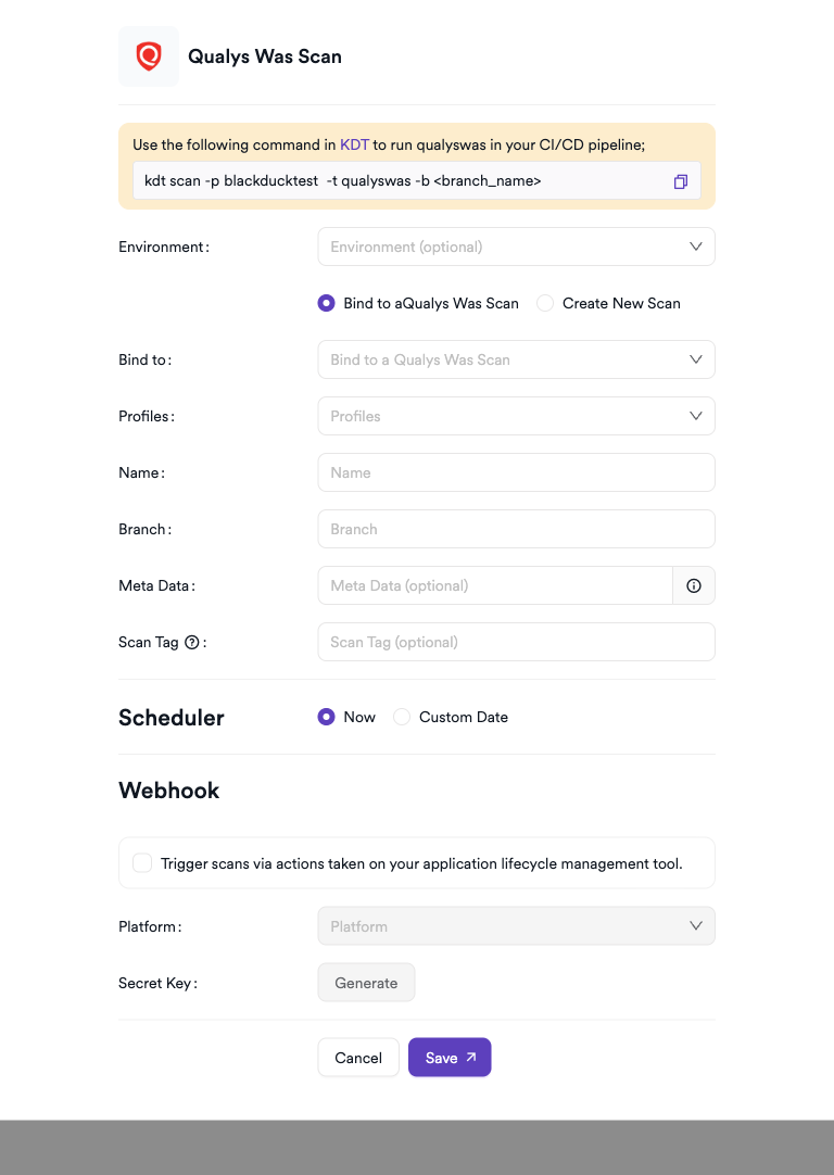 | Bind To | Existing Qualys WAS scan to bind to | Yes |
