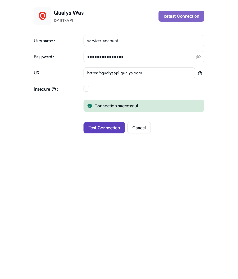 https://qualysapi.qualys.com). - Insecure: Enable this checkbox only if your Qualys instance uses a self-signed SSL certificate.