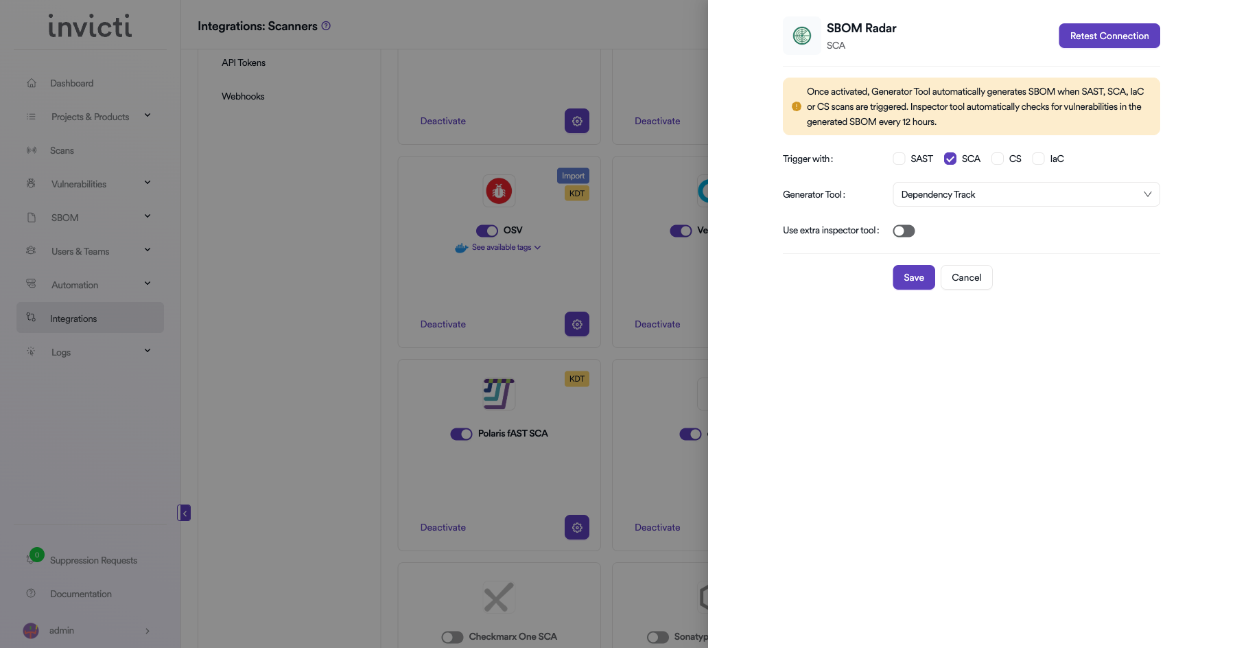 Invicti AppSec supports SBOM Radar as a specialized SCA (Software Composition Analysis) tool. This guide explains how to activate and configure the SBOM Radar integration.