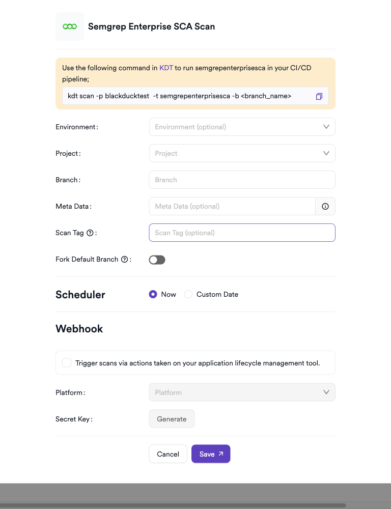 kdt scan -p <project_name> -t semgrepenterprisesca -b <branch_name>