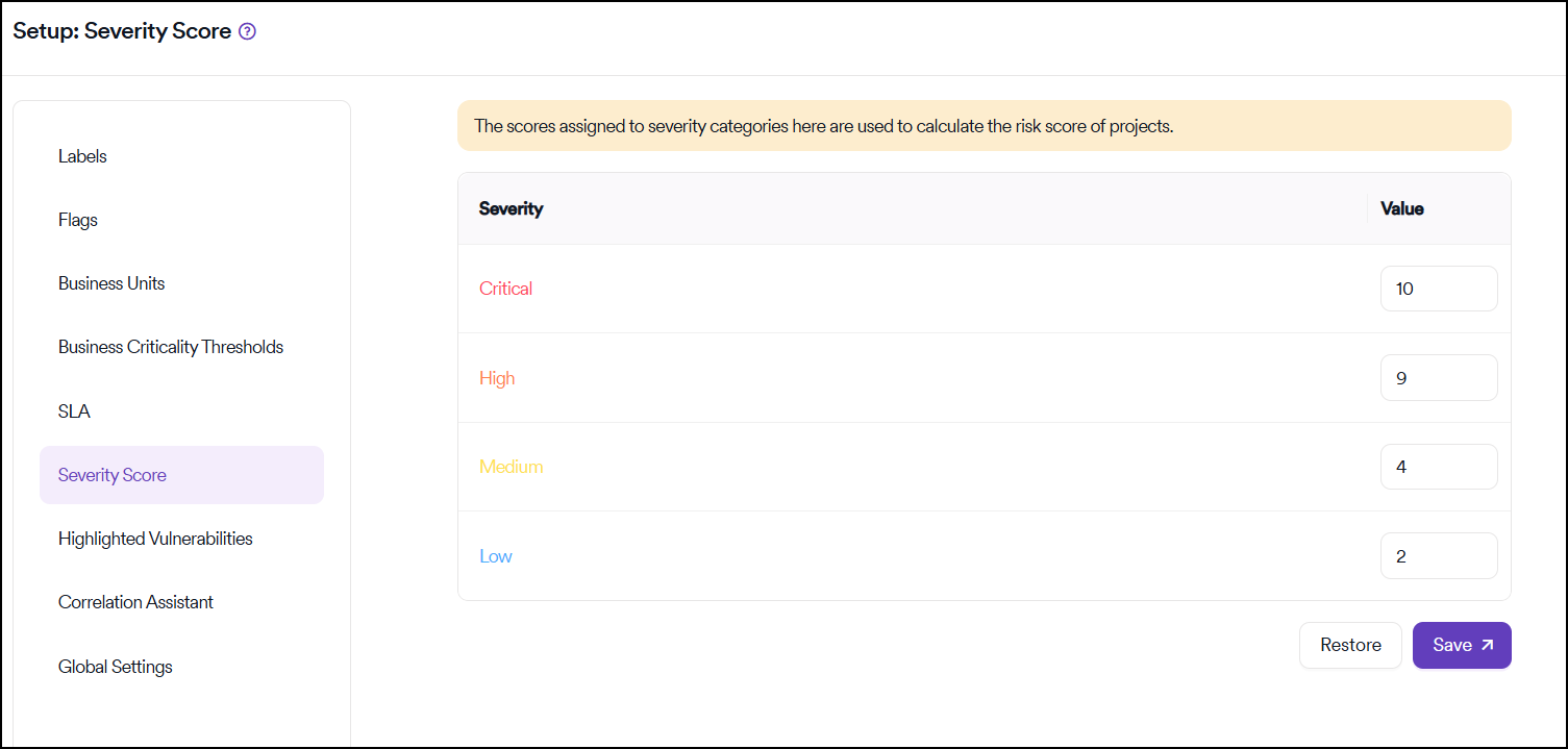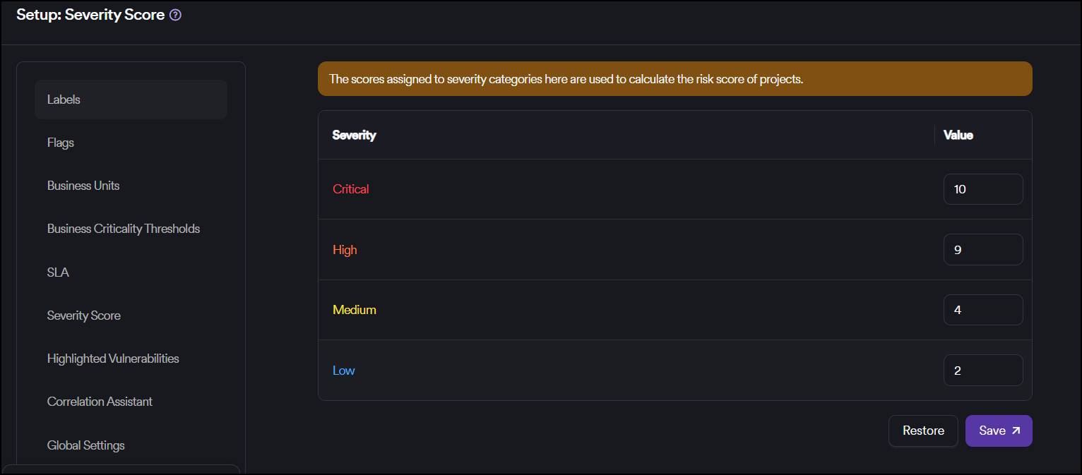 To return the values to their original states, the Restore button can be used. This restores all severity scores to the default configuration shown above.