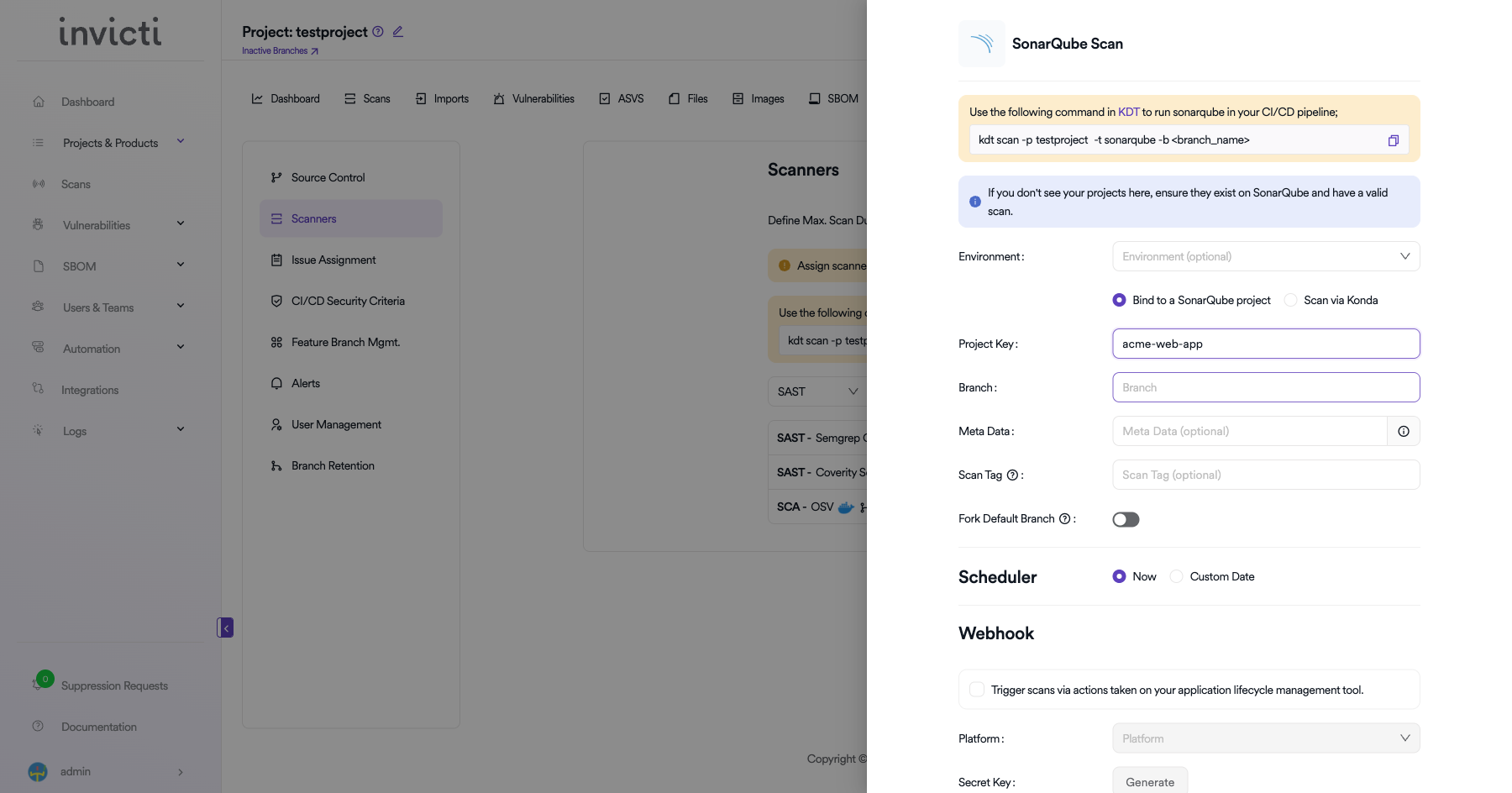 Invicti AppSec supports SonarQube as a SAST (Static Application Security Testing) scanner. This guide explains how to activate and configure the SonarQube integration.