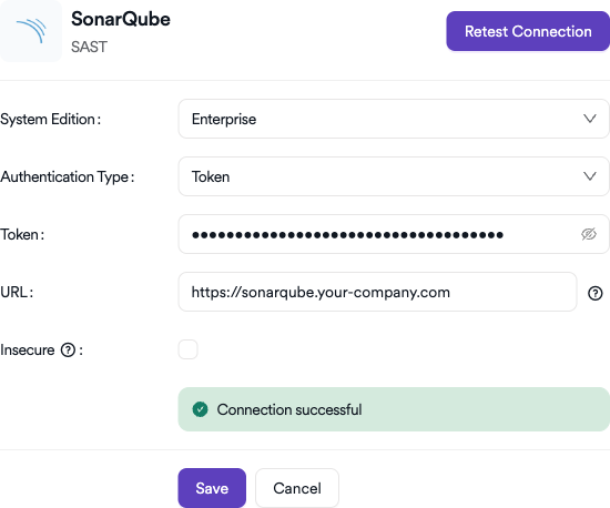 https://sonarqube.your-company.com). - Insecure: Enable this checkbox only if your SonarQube instance uses a self-signed SSL certificate.