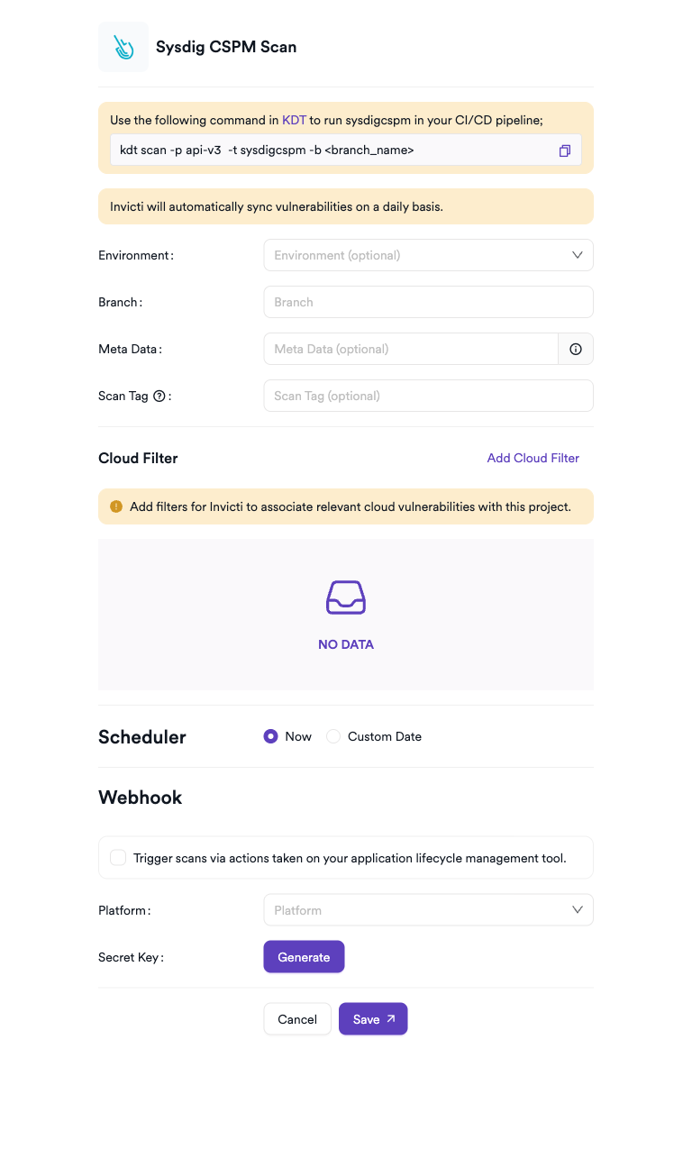 Invicti AppSec automatically syncs Sysdig CSPM vulnerabilities on a daily basis — no manual trigger is required after the initial scan is configured.
