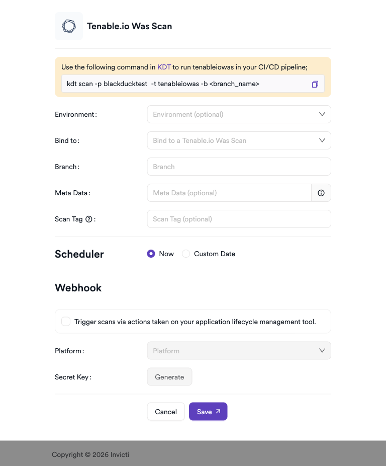 kdt scan -p <project_name> -t tenableiowas -b <branch_name>