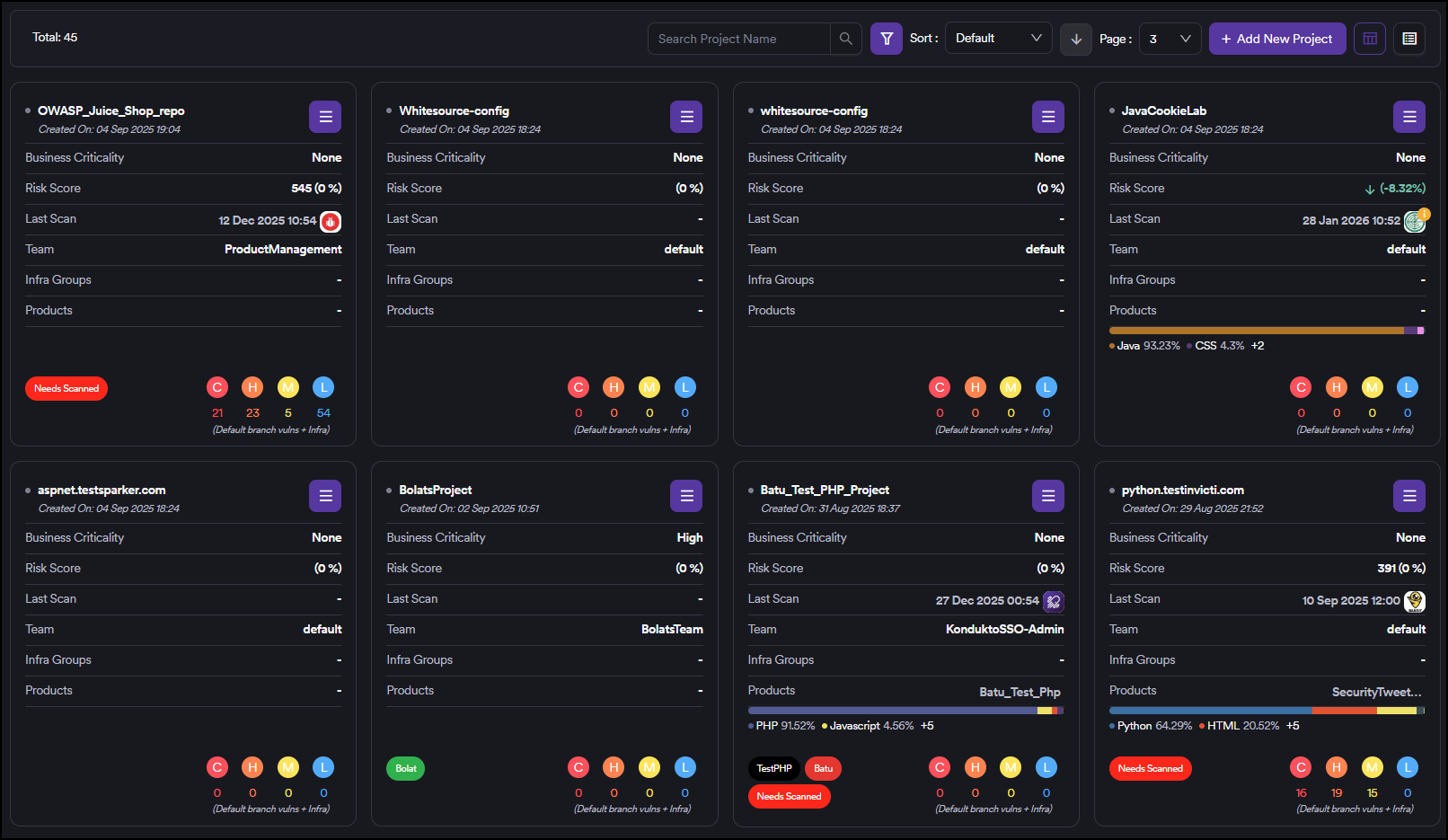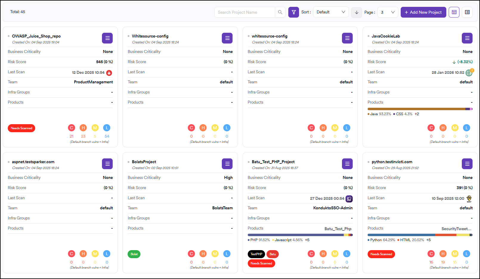 You can view projects as cards in the projects list. You can filter the cards by project, product, team, labels, language, or business criticality. By default, Invicti AppSec sorts projects by the creation date.