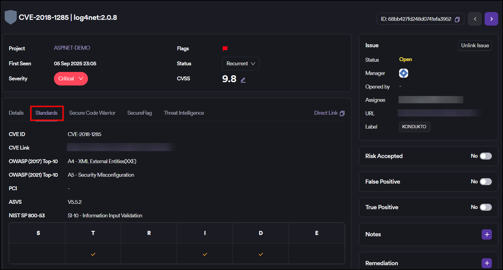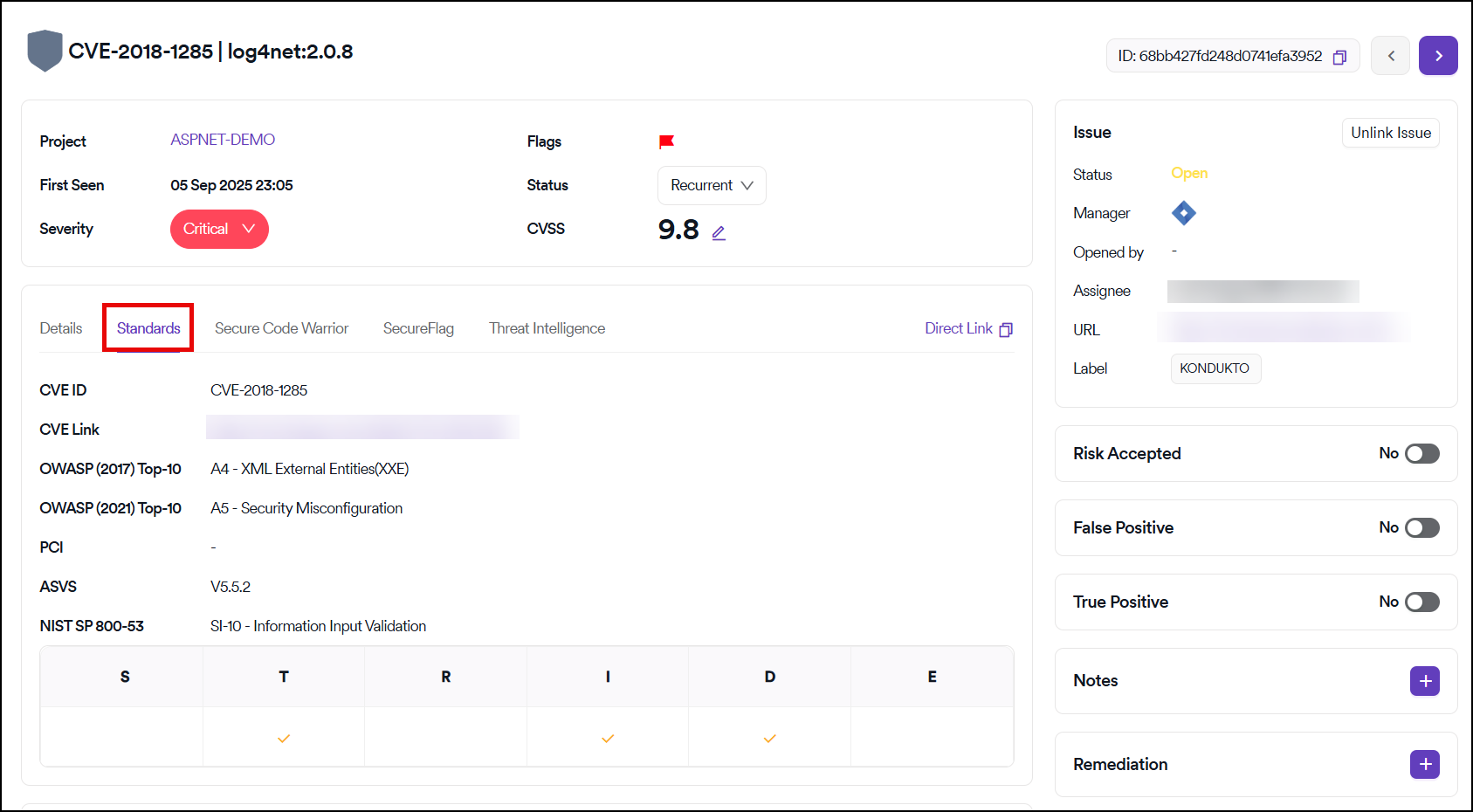 Further information on the industry standards related to the CWE ID of the vulnerability can be found in the Standards tab.