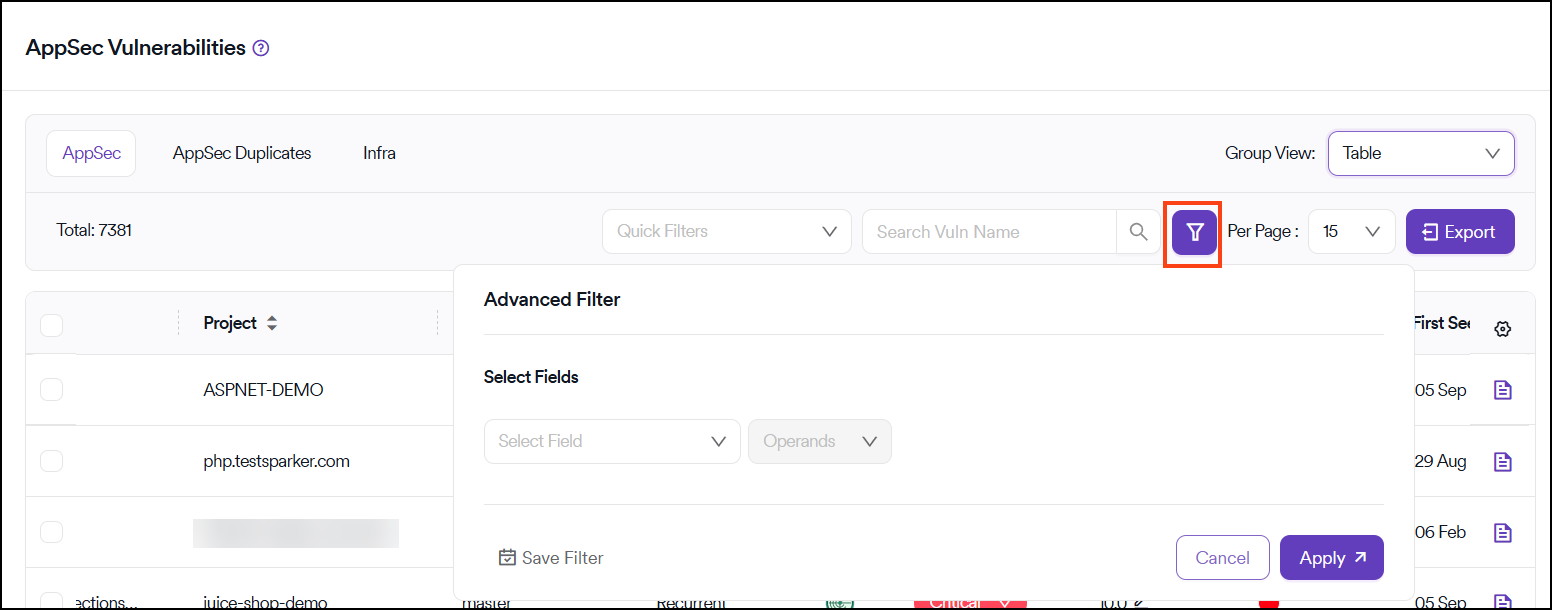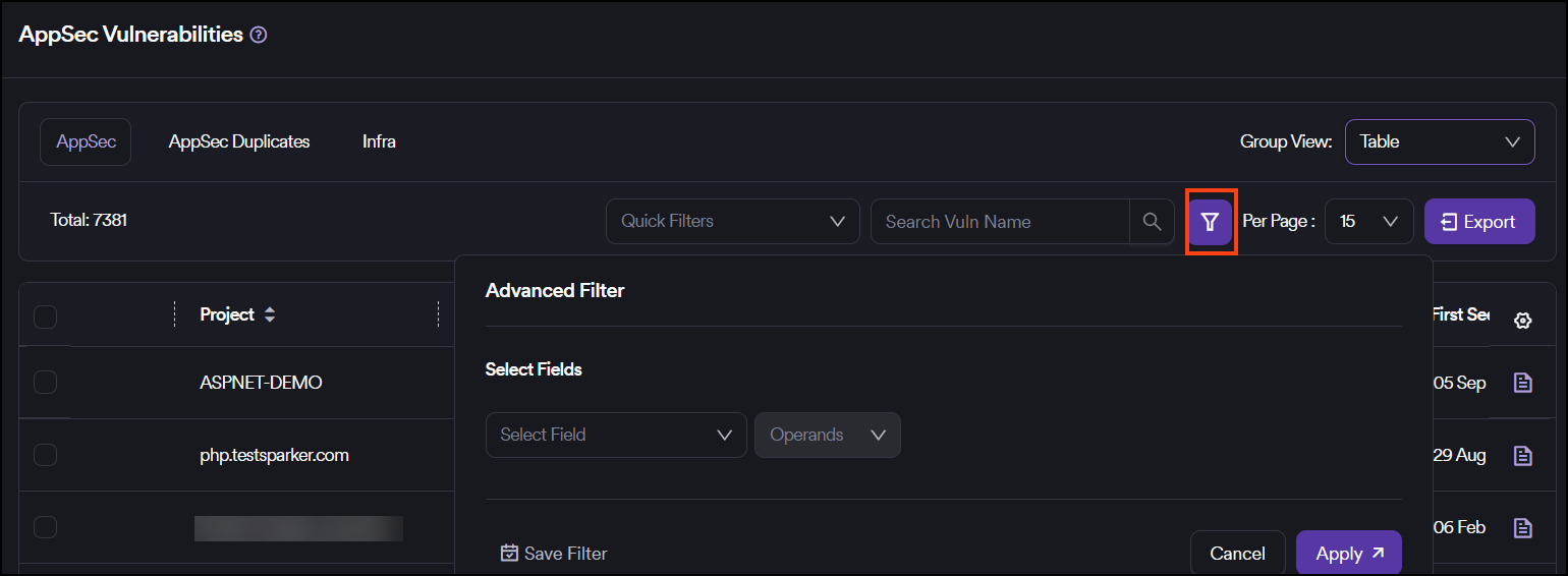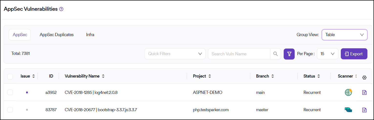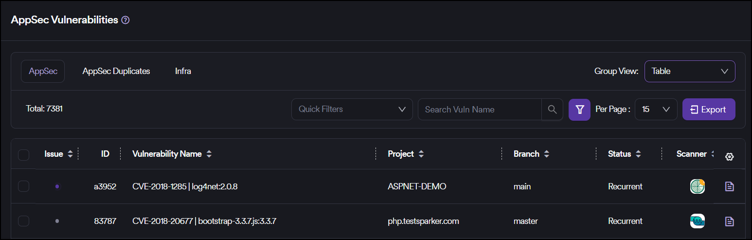 If vulnerability merging is activated in the Global Settings, the system displays a consolidated view of vulnerabilities, excluding any duplicates. If this setting isn't enabled, Invicti AppSec displays all vulnerabilities without exception.